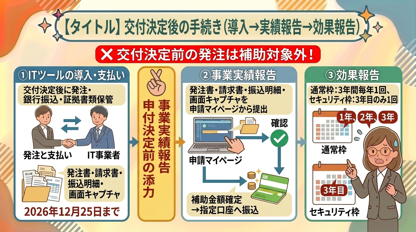 交付決定前にITツールの発注・契約・支払いを絶対に行わないこと。 これが最大の注意点です。