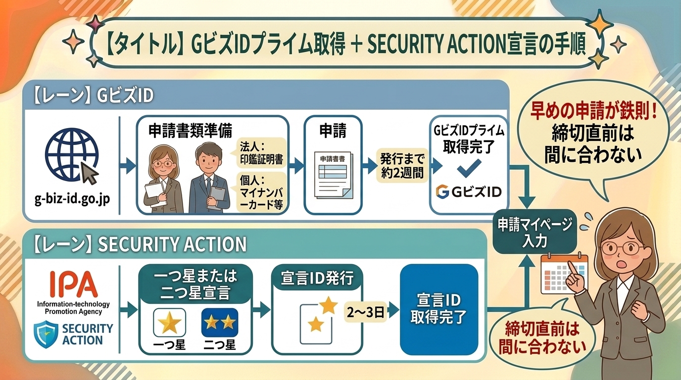例えば、締切まで3週間しかない場合、GビズIDの取得(約2週間)とSECURITY ACTIONの宣言(2〜3日)を同時進行で進めないと間に合わなくなります。今すぐ両方を申請し始めるのが安全です。