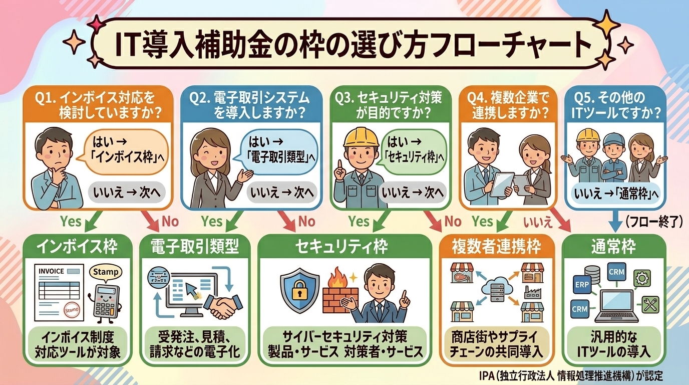 まず、自社が導入したいITツールの目的を一つ絞り、上のフローチャートで該当する枠を確認するところから始めましょう。枠が決まれば、申請の準備はぐっとシンプルになります。