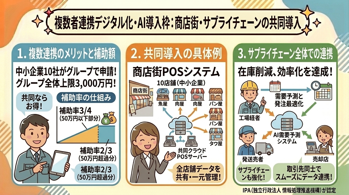 | 複数者連携デジタル化・AI導入枠 | 複数企業の連携IT導入 | 3/4以内〜4/5以内(50万円以下分)、2/3以内(50万円超分) | 3,000万円(グループ全体) |