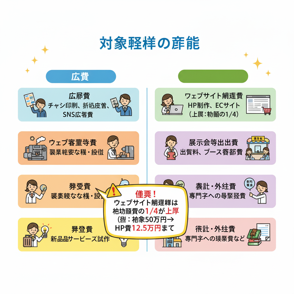 ウェブサイト関連費は補助金全体の1/4が上限です。補助額50万円なら最大12.5万円がHP関連に充てられます。詳しくは → 対象経費ガイド