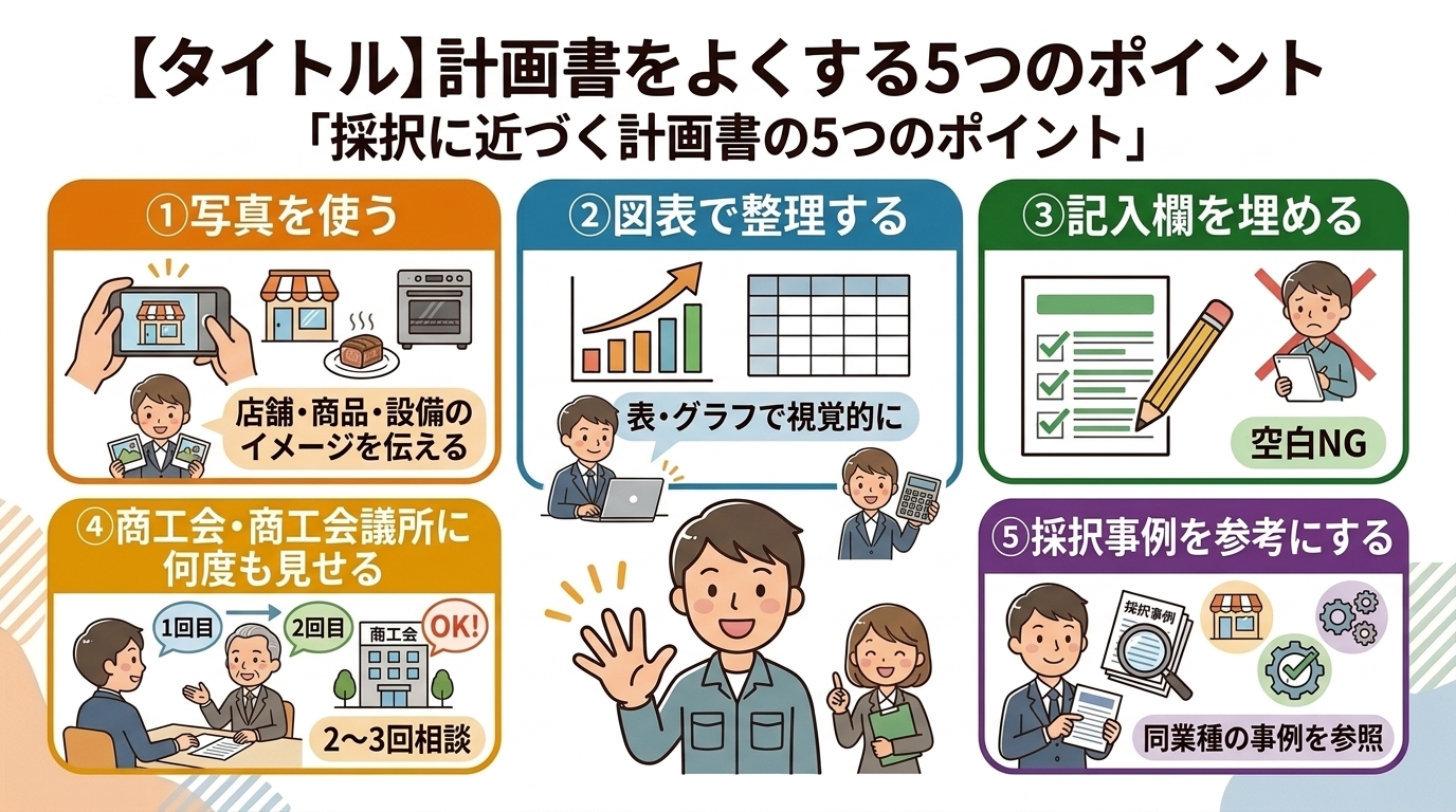 商工会・商工会議所では過去の採択事例を見せてもらえる場合があります。自分の業種・規模に近い事例を参考にすると書き方のイメージがわきます。