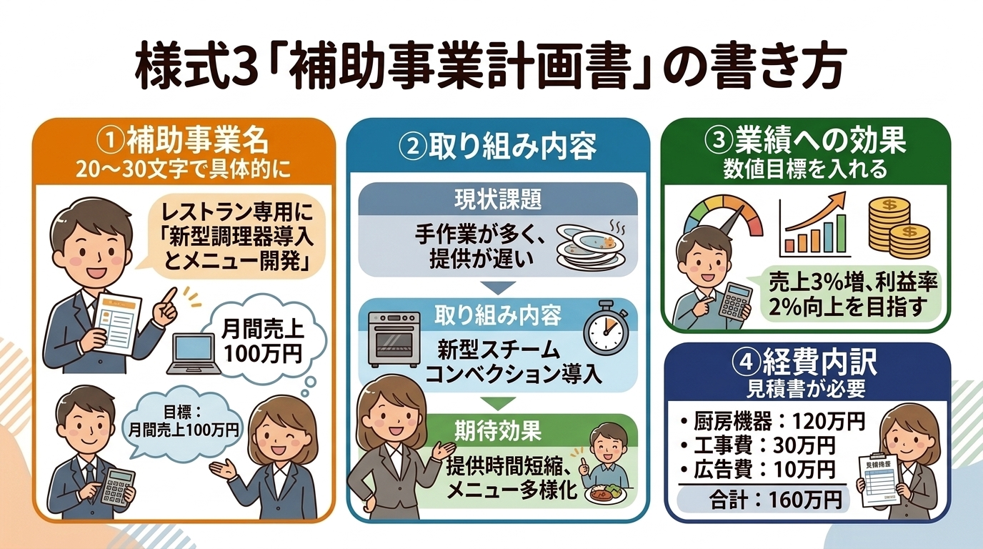 | 補助事業計画書 | 様式3 | 補助事業の内容・実施スケジュール・経費内訳・期待効果 |