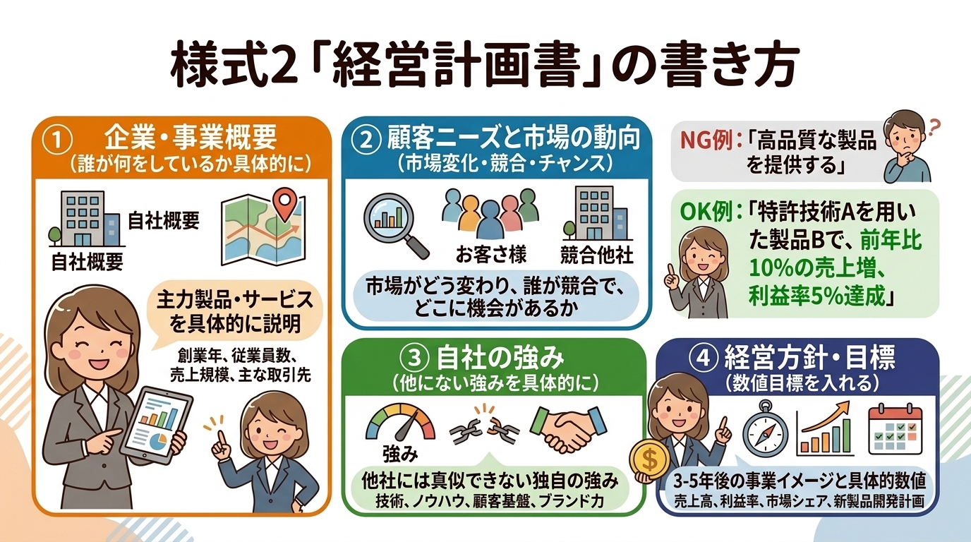 NG例: 「販路拡大事業」(抽象的) OK例: 「地元SNS広告と自社ホームページ刷新による新規顧客獲得事業」(具体的)