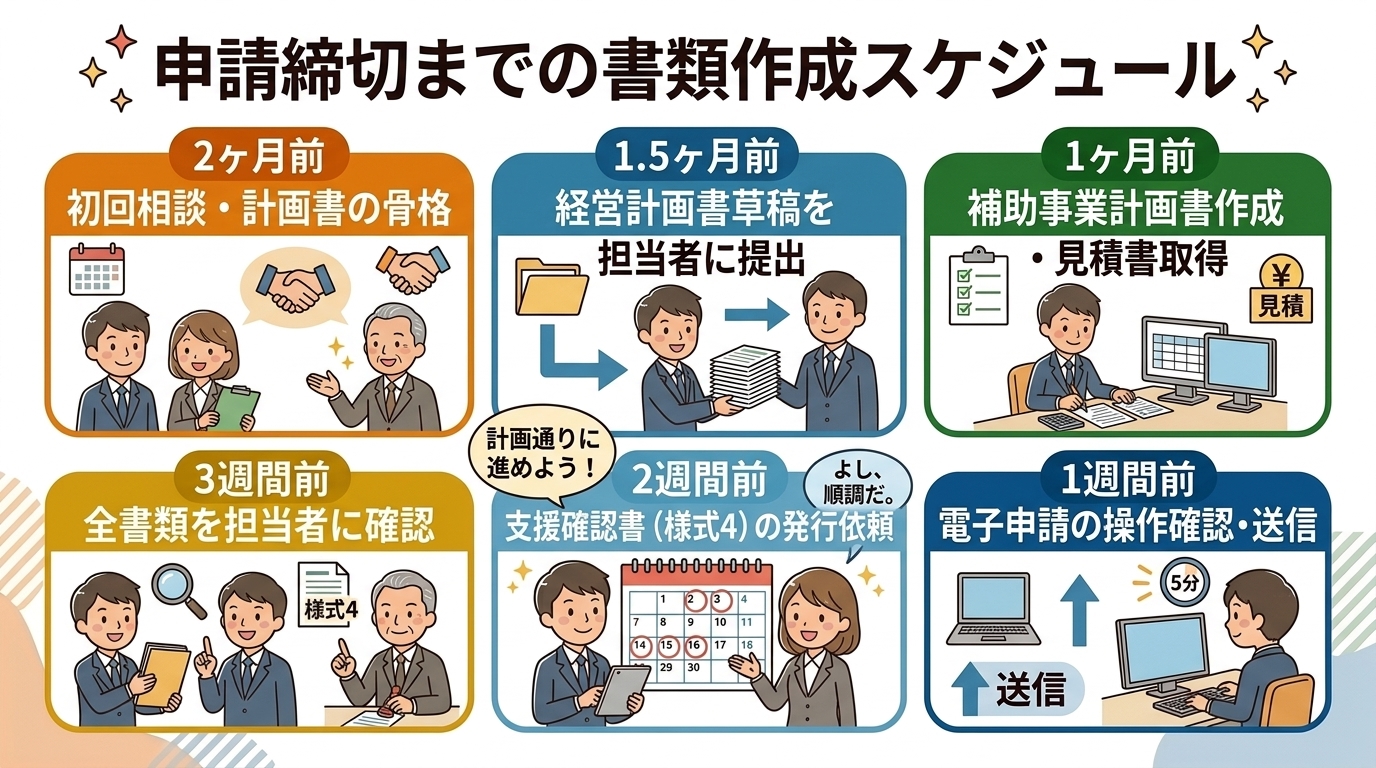 | 申請締切の2ヶ月前 | 商工会・商工会議所に初回相談。計画書の骨格を作る |