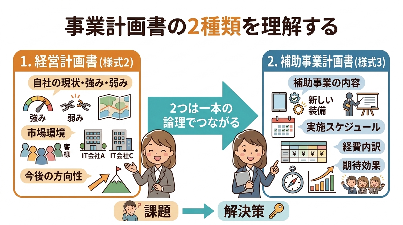 この2つは別々の書類ですが、一本の論理でつながっている必要があります。「経営計画書で明らかにした課題を、補助事業計画書で解決する」という流れが採択への基本です。