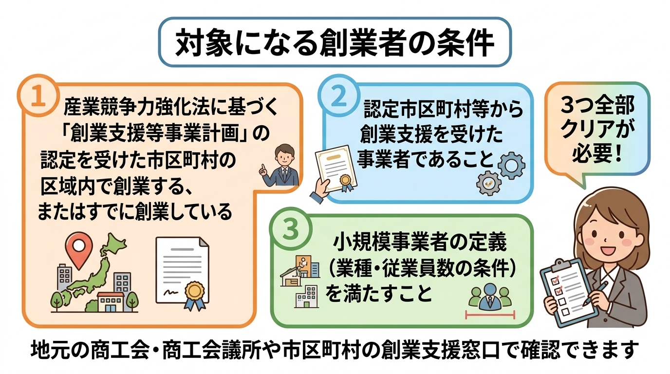 | 対象 | 小規模事業者全般 | 産業競争力強化法に基づく認定市区町村等の創業支援を受けた事業者 |