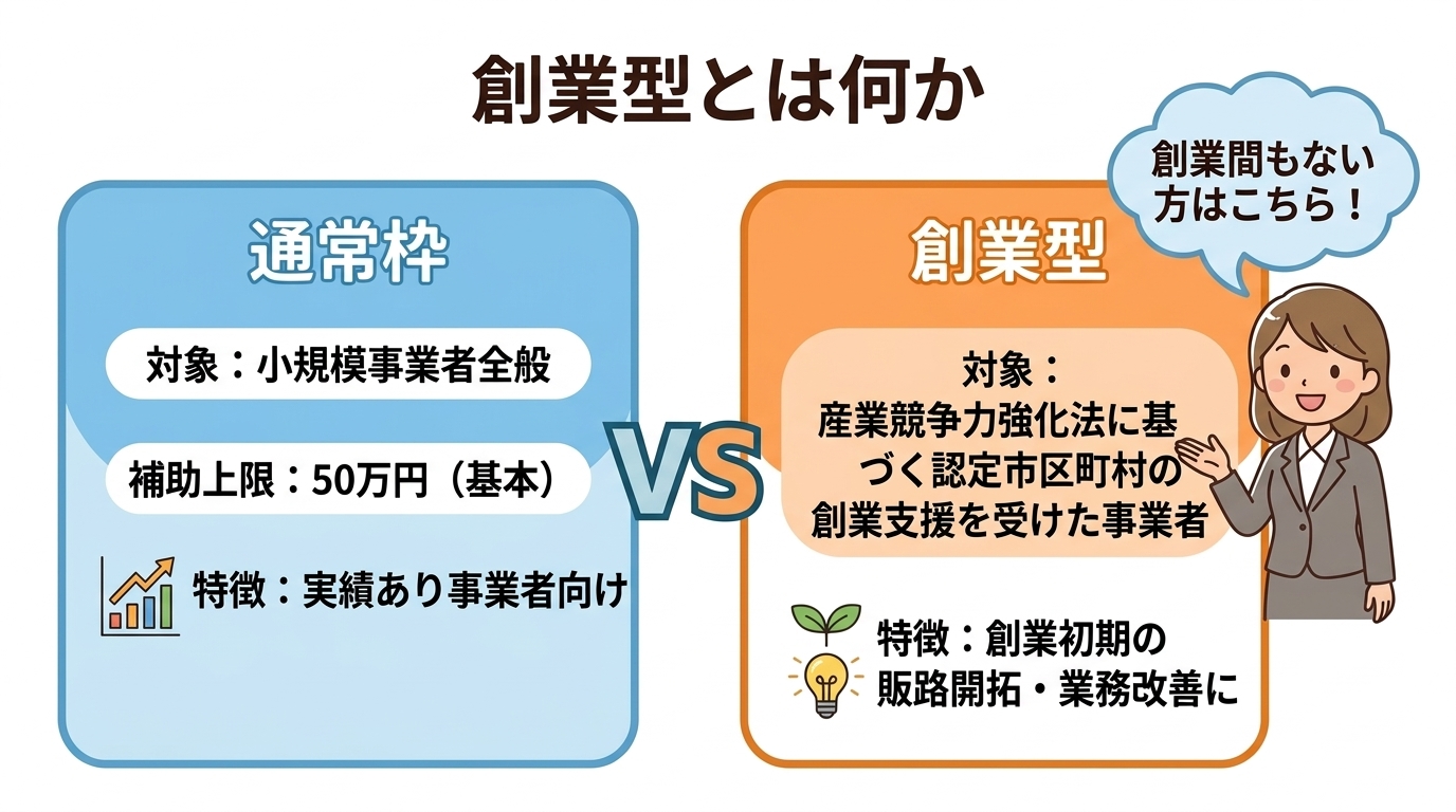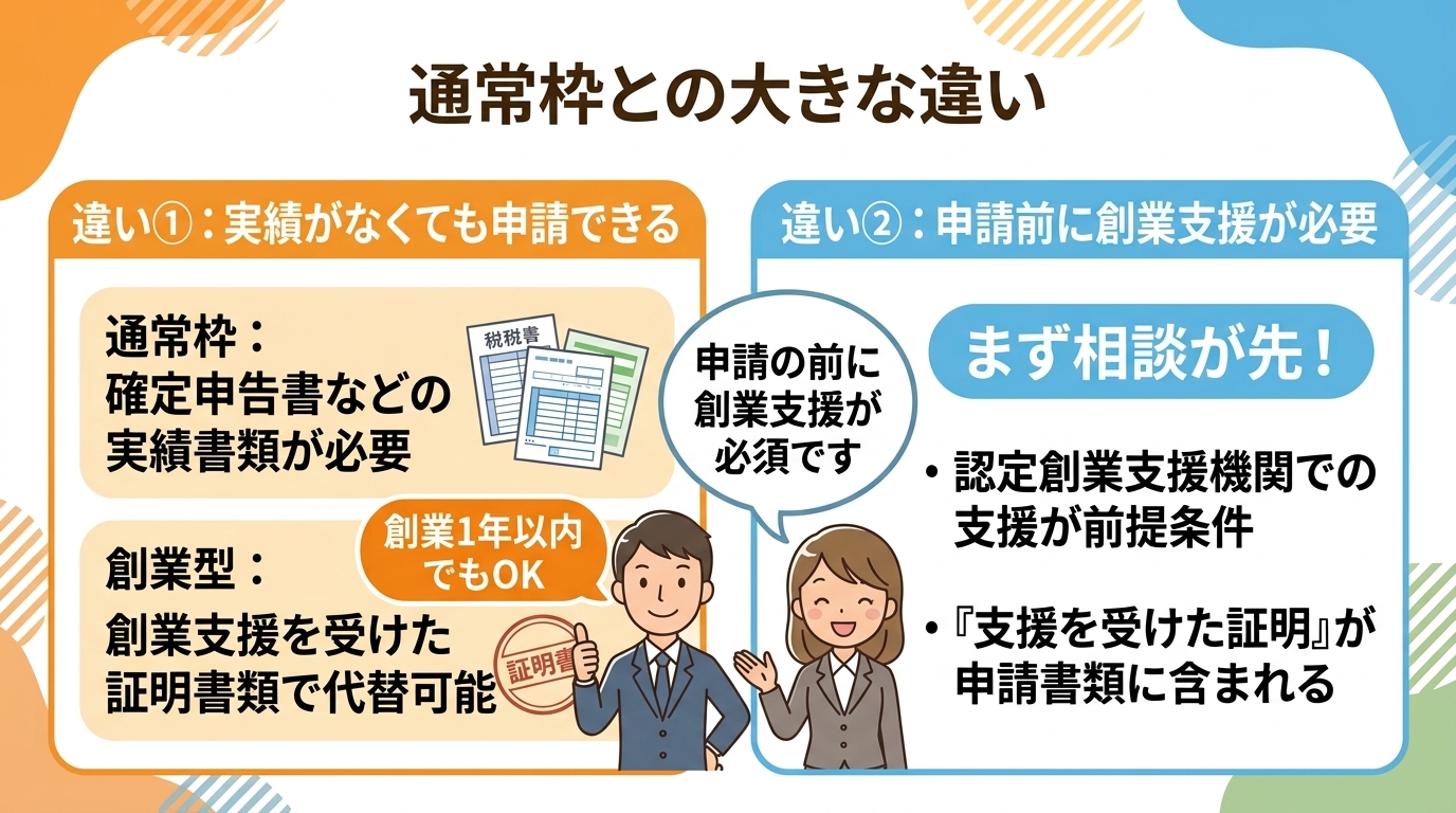 創業型は、通常枠と別に設けられた類型で、以下の点が異なります。