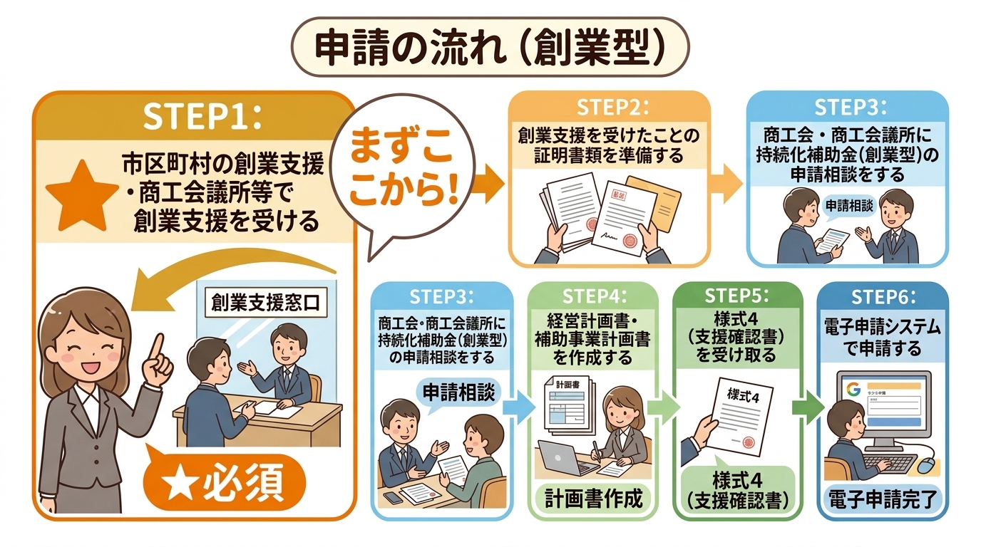 編集部より: 「創業型」を使うには、事前に市区町村の認定を受けた創業支援機関(商工会・商工会議所、金融機関、NPO等)による支援を受けることが条件になります。「まず相談してみる」という行動が申請の前提です。